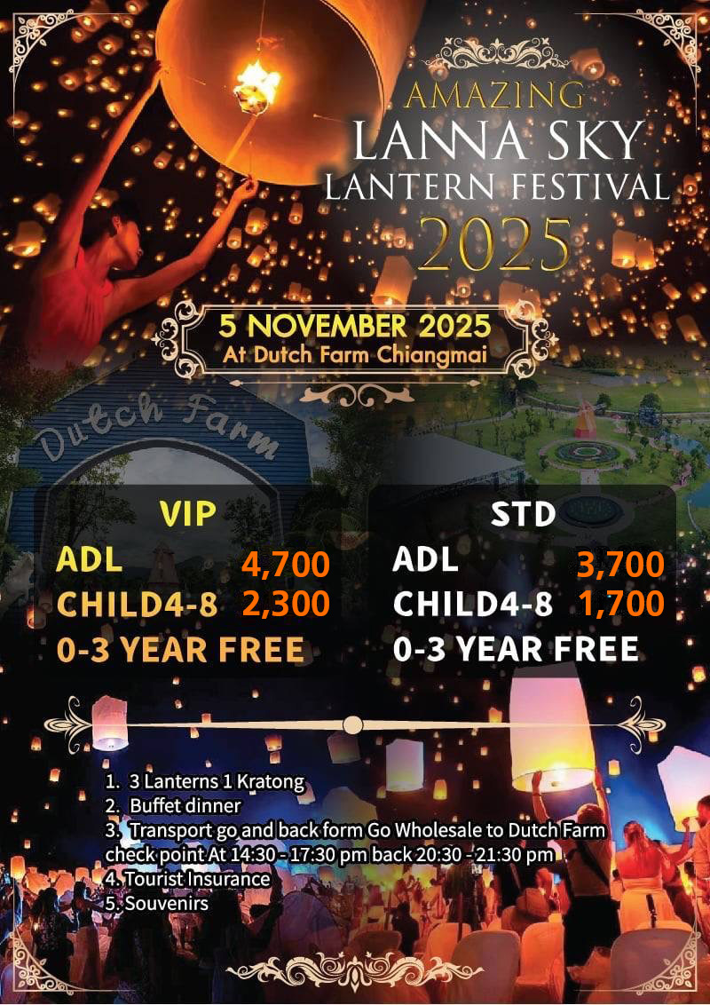 14.30 – 17.00 hrs. Meeting point for boarding the bus at GO Wholesale @ Central Airport Plaza to board the bus to the Amazing Lanna Sky Lantern Festival 2025 @ Dutch Farm, Mae On subdistrict, San Kamphaeng district.